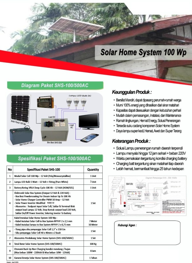 Paket Solar Home System 100 Wp, Pembangkit Listrik Tenaga Surya untuk rumah warga yang belum tercover PLN bahkan bisa juga digunakan untuk penghematan listrik rumah. Solusi penerangan dan aplikasi kebutuhan rumah tangga dengan memanfaatkan panas sinar matahari yang murah, bermanfaat dan berkelanjutan sangat effisien serta alternatif terbaik untuk wilayah yang belum terjangkau PLN saat ini. Paket SHS 100 Wp ini mengahsilkan 300 hingga 450Watt perhari dan digunakan untuk penerangan dan beban 220Volt yang mana bisa ditambah lagi lampu jika kurang. Dengan kwalitas terbaik dikalangannya dan harga terjangkau dengan desain aman, fleksibel dan ramah lingkungan serta hemat energi. Paket Penerangan Listrik Rumah (PLR) 100 Watt sangat cocok untuk program PNPM dengan 6 lampu hemat energi dan bisa untuk backup 3 hari. Bisa ditambah lampu sendiri dan diaplikasikan dengan yang lainnya sesuai kehendak.