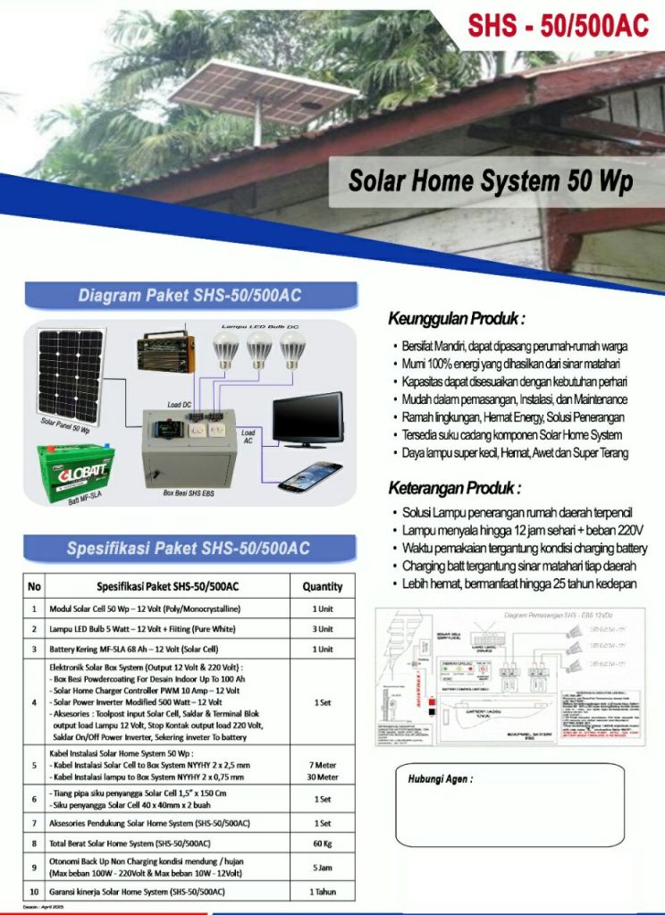 Paket Solar Home System 50 Wp, Pembangkit Listrik Tenaga Matahari yang ramah lingkungan dan tidak pernah habis serta bermanfaat hingga 25 Tahun lamanya. Solar Home System 50 Wp ini mengahsilkan 150 Watt hingga 300 Watt perhari (tergantung sinar matahari daerah) yang diaplikasikan khusus untuk penerangan tempat tinggal atau rumah-rumah warga yang belum terjangkau listrik PLN ini sangat tepat dan berguna. Dengan memakai lampu LED Bulb DC 5 Watt rumah anda sudah terang layaknya listrik PLN, dan box battery anti karat agar tahan lama dan awet tanpa korosi. Paket ini hanya untuk penerangan saja dengan output tegangan 12Volt, selain penerangan juga bisa untuk digunakan elektronik lainnya yang bertegangan 12Volt seperti radio, Televisi, dll. Paket Penerangan Listrik Rumah (PLR) 50 Watt sangat cocok untuk program PNPM dengan 3 lampu hemat energi dan bisa untuk backup 3 hari. Bisa ditambah lampu sendiri dan diaplikasikan dengan yang lainnya sesuai kehendak.
