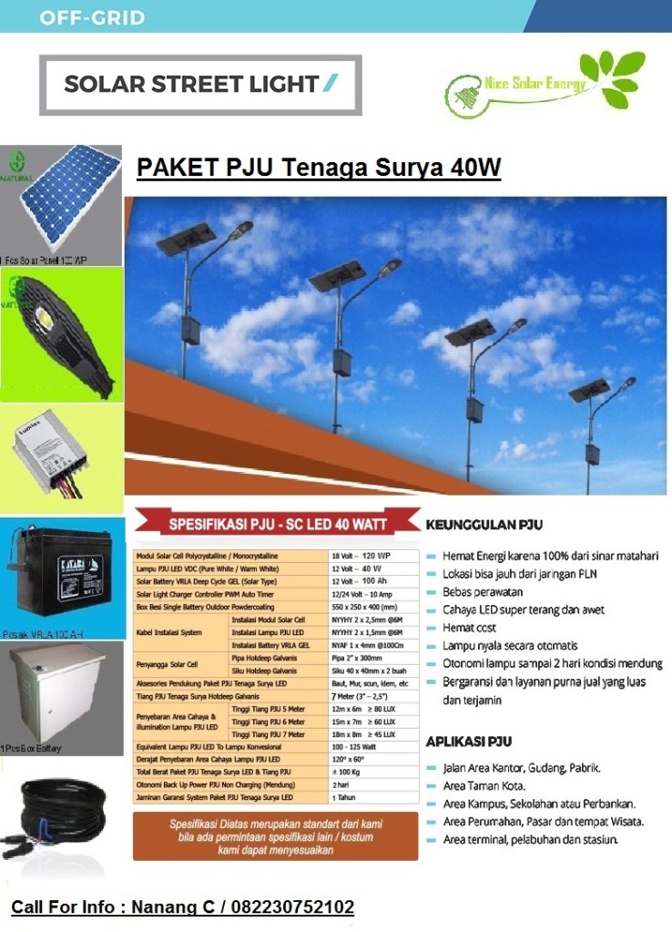 PAKET PJU SOLAR CELL 40 WATT LED merupakan sebuah alternatif yang pas karena dengan harga yg terjangkau dan hemat untuk digunakan sebagai sumber listrik penerangan. PAKET PJU SOLAR CELL 40 WATT LED sangat cocok di aplikasikan baik di Lampu Jalan perkotaan, Lampu Taman, Lampu Penerangan Daerah Wisata, Lampu Dermaga, Lampu Lapangan Parkir, Lampu Jalan Raya Terpencil, Lampu Jalan Pedesaan, Lampu Lapangan Olah Raga, Dll yang jauh dari sumber energi listrik PLN maupun sumber-sumber listrik yang lain. Dengan menggunakan PAKET PJU SOLAR CELL 40 WATT LED ini, kita sudah memiliki Sumber Energi sendiri tanpa ketergantungan dengan pihak lain (MANDIRI), Dan pastinya hemat Biaya dan ramah lingkungan.