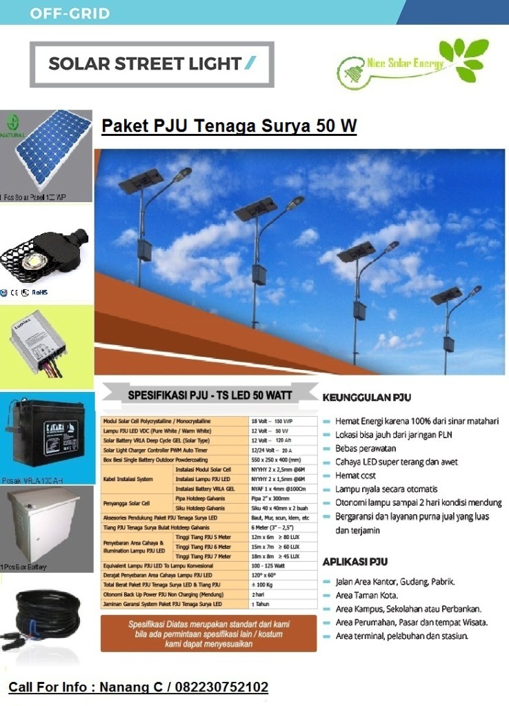 PAKET PJU SOLAR CELL 50 WATT LED merupakan sebuah alternatif yang pas karena dengan harga yg terjangkau dan hemat untuk digunakan sebagai sumber listrik penerangan. PAKET PJU SOLAR CELL 50 WATT LED sangat cocok di aplikasikan baik di Lampu Jalan perkotaan, Lampu Taman, Lampu Penerangan Daerah Wisata, Lampu Dermaga, Lampu Lapangan Parkir, Lampu Jalan Raya Terpencil, Lampu Jalan Pedesaan, Lampu Lapangan Olah Raga, Dll yang jauh dari sumber energi listrik PLN maupun sumber-sumber listrik yang lain. Dengan menggunakan PAKET PJU SOLAR CELL 50 WATT LED ini, kita sudah memiliki Sumber Energi sendiri tanpa ketergantungan dengan pihak lain (MANDIRI), Dan pastinya hemat Biaya dan ramah lingkungan.